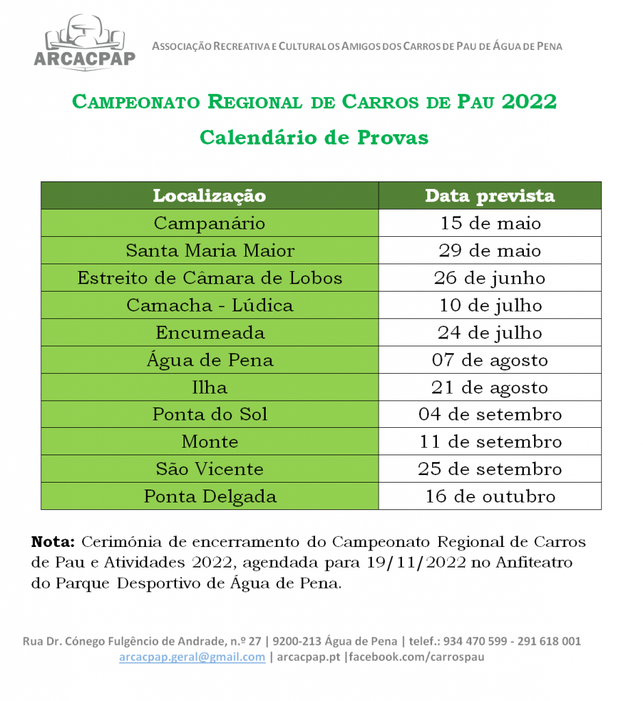 No que diz respeito ao campeonato regional de carros de pau, época 2020, o mesmo foi cancelado devido às restrições implícitas relativas ao covid-19. Contudo, caso alguma entidade local pretenda realizar alguma prova, a ARCACPAP estará sempre disponível, desde que estejam reunidas as condições mínimas exigidas (logística e saúde) bem como a devida autorização das entidades regionais de saúde. Caso isso aconteça, informaremos a todos os interessados.